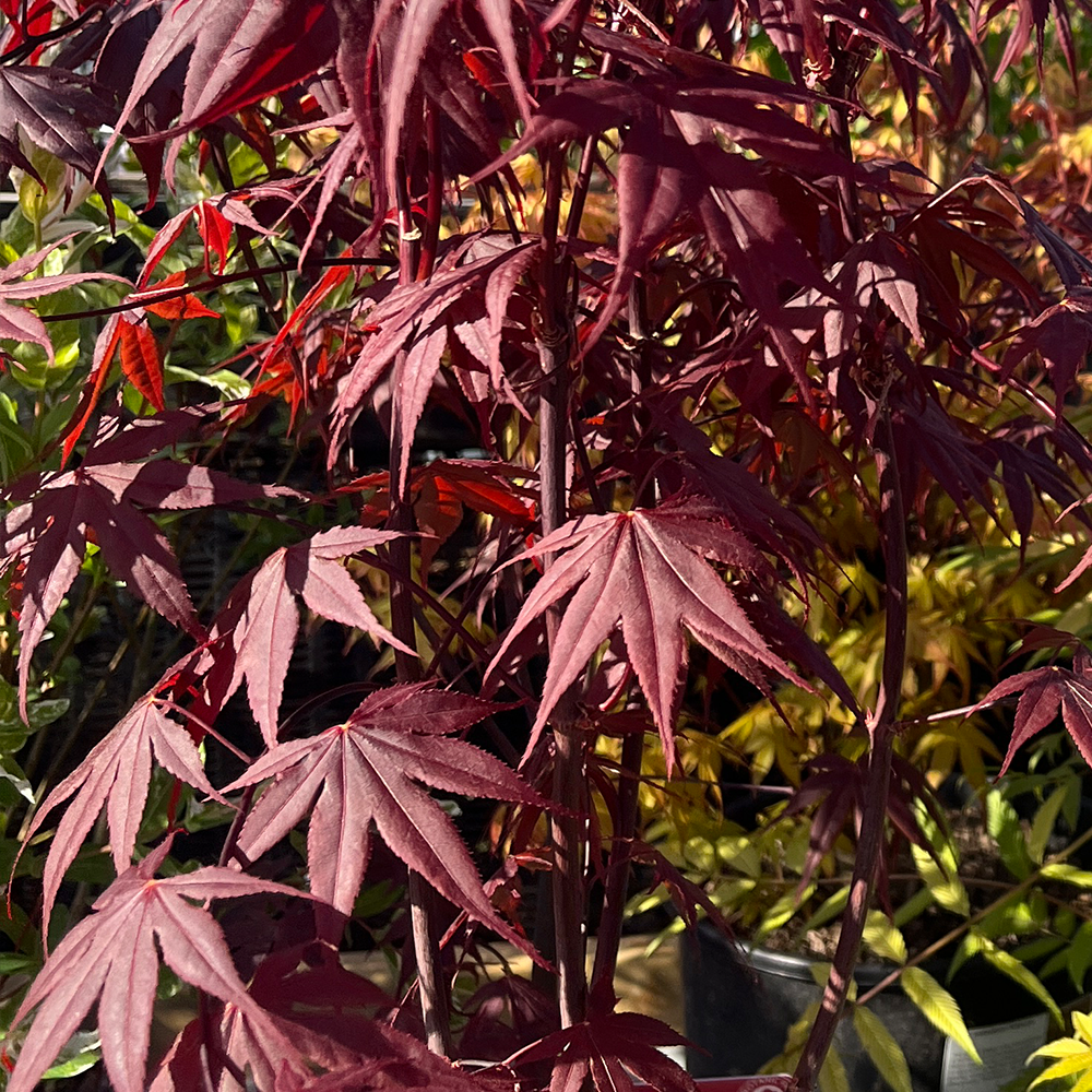 To create a striking focal point, plant it where the sun can backlight the foliage, or pair it with the golden leaves of ornamental grasses or the dark tufts of Ophiopogon planiscapus 'Nigrescens' for contrast. While 'Bloodgood' is hardier than most, it still thrives best in a sheltered spot away from strong winds. To ensure the plant establishes a strong root system, we recommend using Rootgrow when planting. To maintain the vibrant leaf colour and plant health, apply Vitax Acer Feed during the growing season.