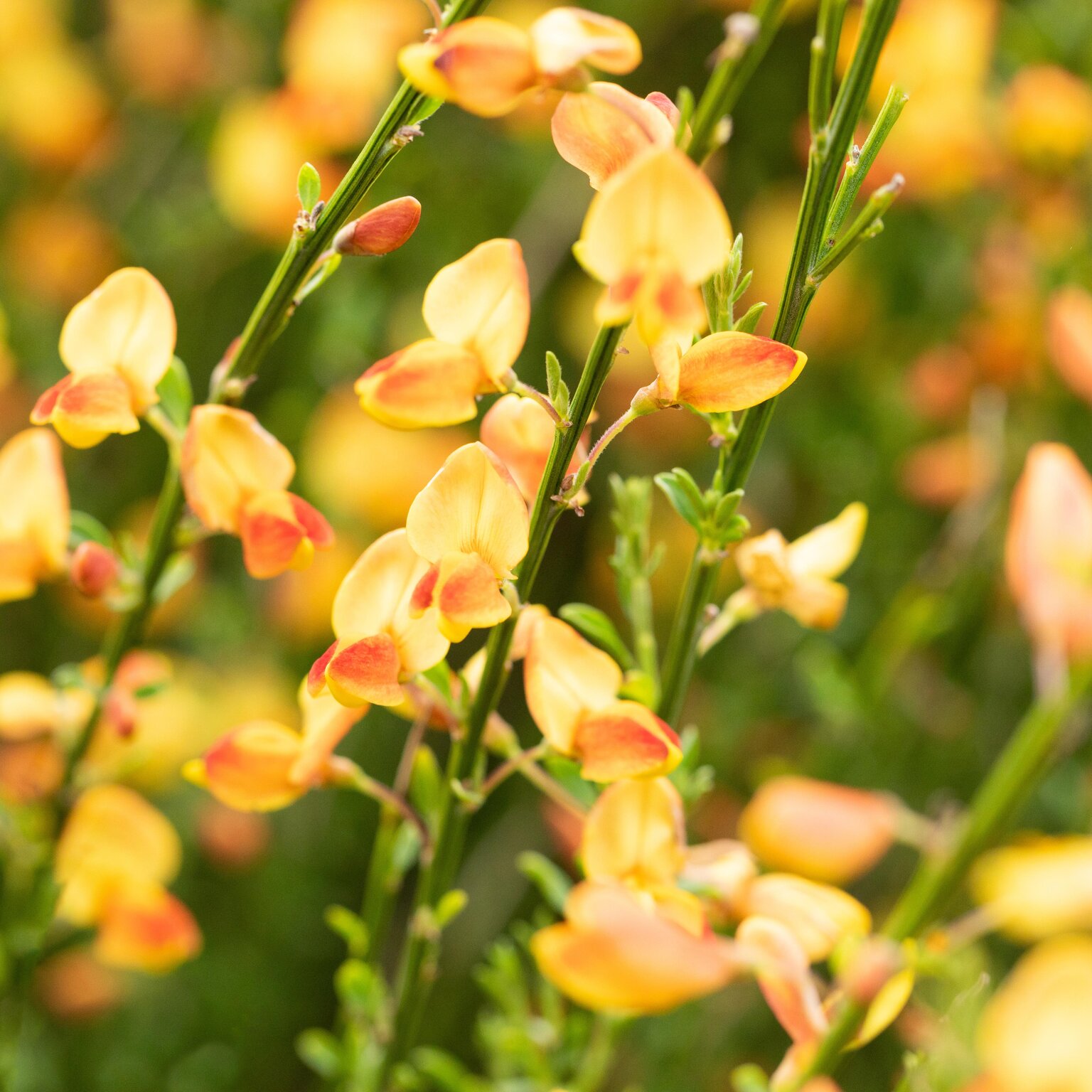 'Apricot Gem' is a standout variety of Broom, prized for its exceptionally warm and luminous colour palette. In May and June, the slender, arching green stems are almost entirely hidden by masses of fragrant, butterfly-shaped blooms. The flowers feature a beautiful blend of coppery-orange and soft apricot, creating a glowing effect in the garden. Its small, inconspicuous green leaves allow the architectural "rush-like" stems to take centre stage.