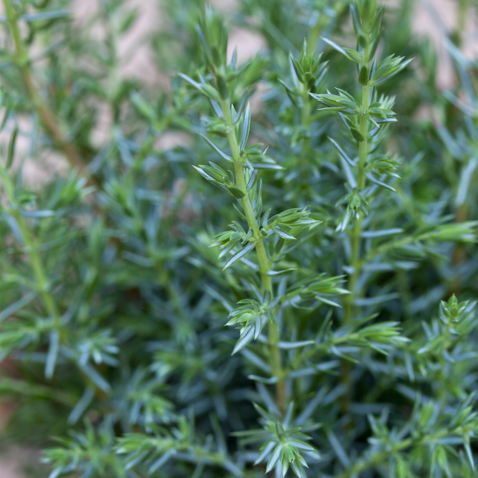 This variety is highly sought after for its extremely slow growth and incredibly tight, vertical habit. It grows almost entirely upwards, rarely spreading more than 30cm wide, making it one of the best choices for small gardens, rockeries, or containers where vertical structure is needed but space is limited. The foliage is short, prickly, and held close to the stem, displaying a silvery blue-green colour that adds texture and contrast to borders throughout the year.