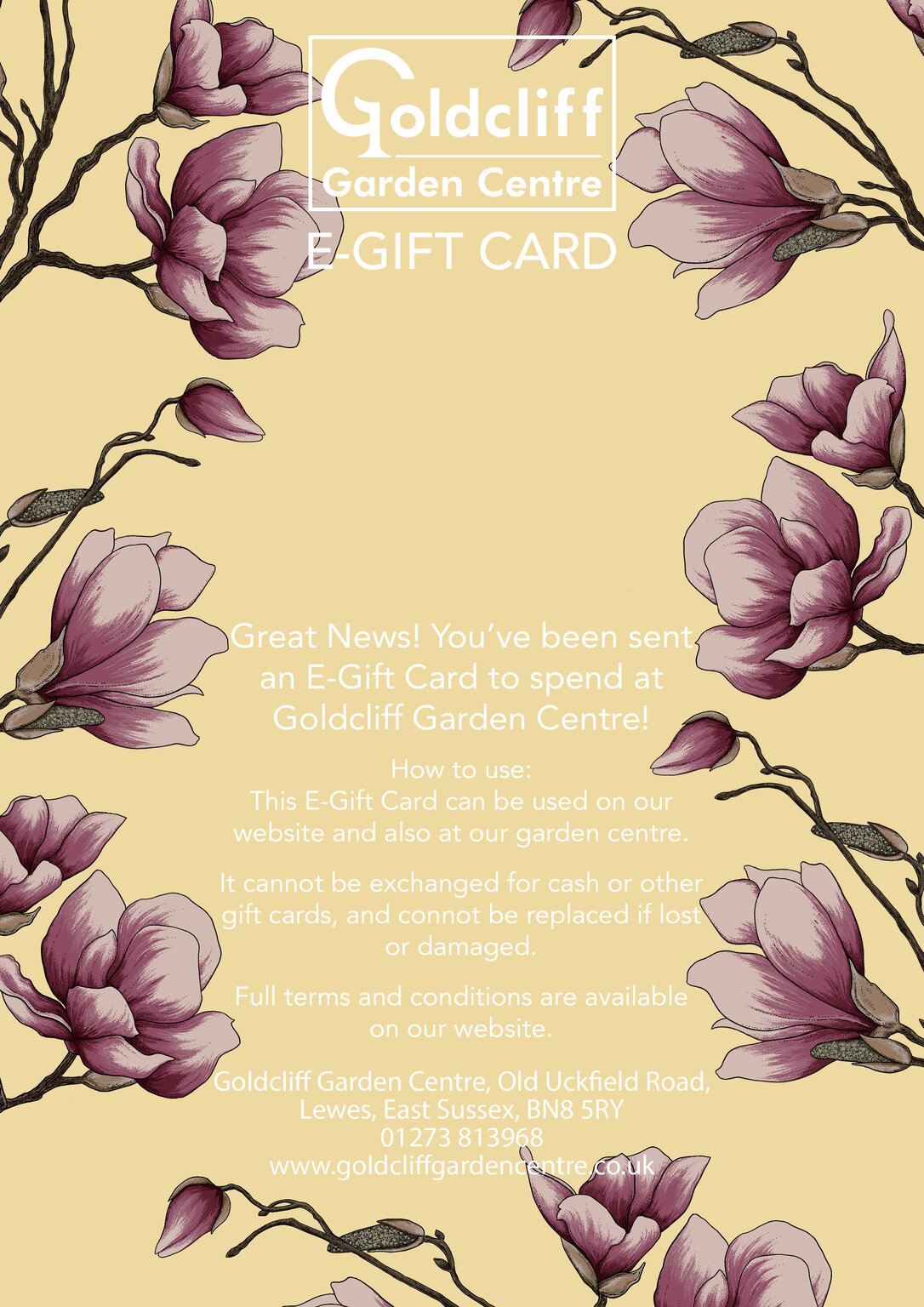 Goldcliff Garden Centre E-Gift Cards can be redeemed in-store at Goldcliff Garden Centre and also our online shop.
