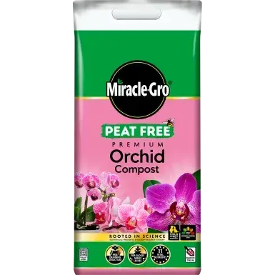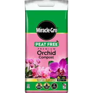 For re-potting: Remove the plant from its existing pot. Divide the plant if appropriate. Remove any dead roots. Select a new pot that is one size larger (or smaller for each division). Cover the base of the pot with broken crocks or gravel. Add a layer of Miracle-Gro® Premium Orchid Compost. Place the Orchid in the pot so the crown is just below the rim. Place more compost between and around the roots, tapping the pot to settle the compost. Water thoroughly with clean, tepid rainwater. Support with a cane if necessary.