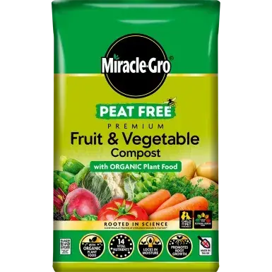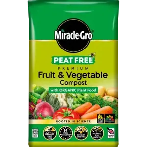 Use as special compost for containers: Cut the top of your Miracle-Gro® Peat Free Premium Fruit & Vegetable Compost with Organic Plant Food and use as a special compost for your fruit and vegetables in containers. Place a layer of compost in the base of the pot. Tap out the plant from the old pot, loosen the root ball and place in the centre of the pot. Fill the space around the root ball, ensuring the compost level covers all the roots. Firm lightly, water thoroughly and let drain.
