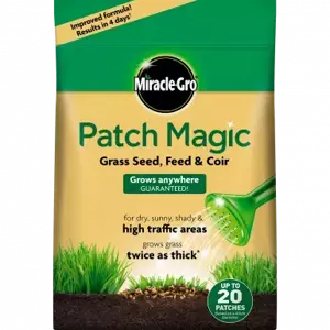 - Remove any dead grass from the patchy area, loosen the soil with a rake and give the area a thorough soaking with water.