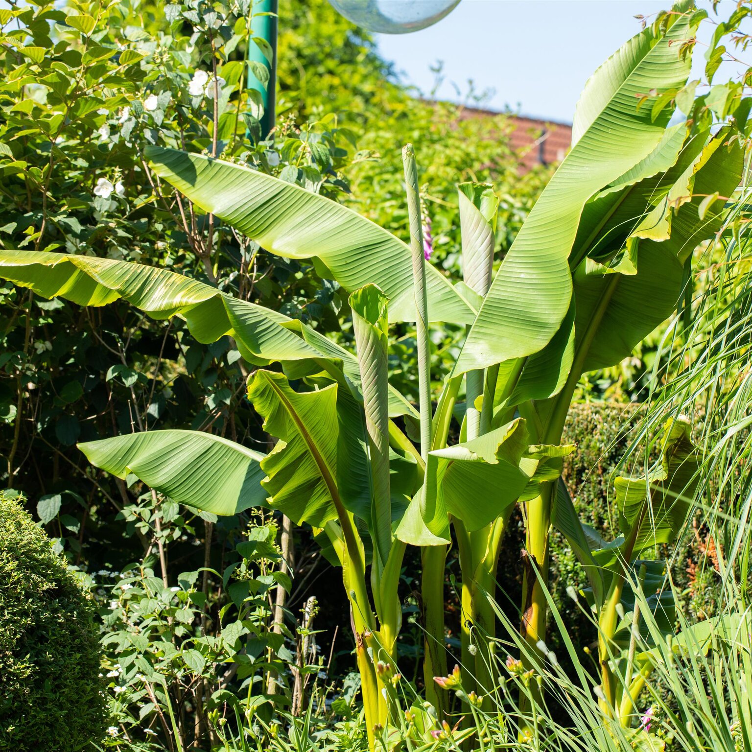 The Japanese Banana is an absolute powerhouse of exotic beauty for the temperate garden. Though it forms a trunk-like 'pseudostem', it is botanically a herbaceous plant, growing new, massive, bright green leaves up to 2 metres long every summer. When given abundant water and food, a mature clump can reach impressive heights, forming a stunning jungle-like feature. In exceptionally mild summers, mature plants may produce highly ornamental, but inedible, banana flower spikes.
