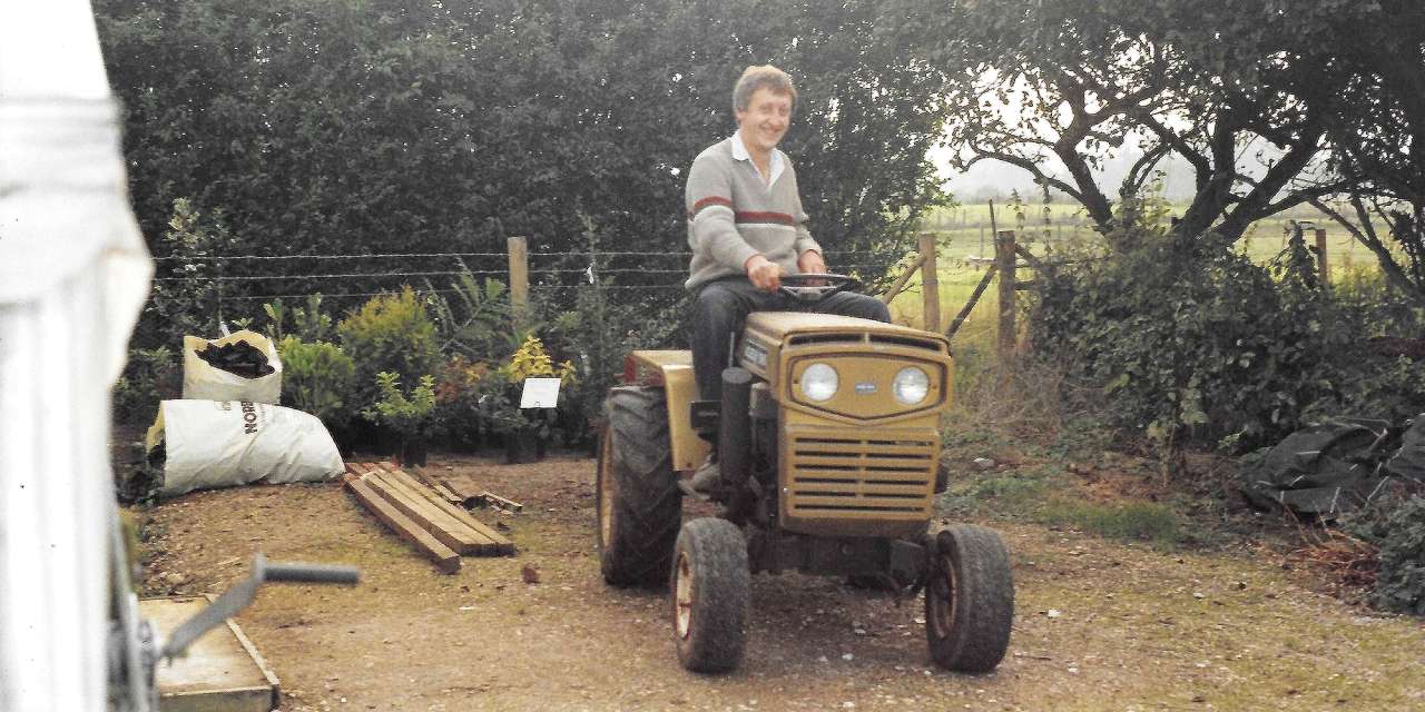 Matthew on his old ride-on mower that was used to transport plants around the nursery by pulling the trolleys.