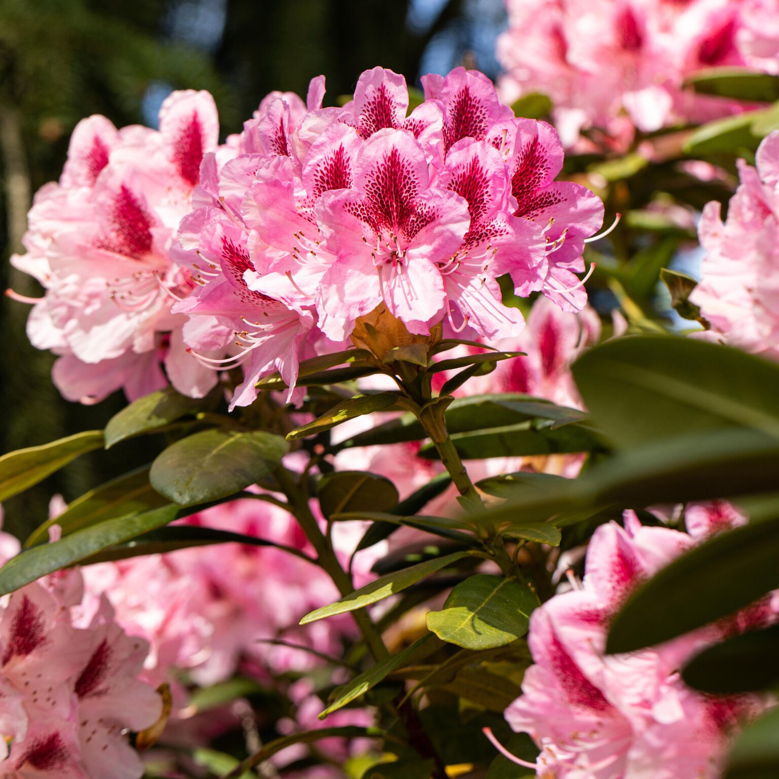'Cosmopolitan' is widely considered one of the best pink Rhododendrons for the modern garden. It is particularly valued for its exceptionally tidy and compact growth habit, forming a dense, rounded mound of leathery, dark green foliage. In late spring, the plant is almost entirely obscured by a spectacular display of large, bright pink flower clusters. Each individual bloom features a dramatic, darker blotch that adds depth and character to the floral display.