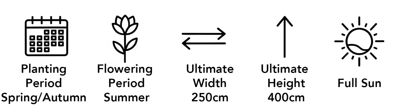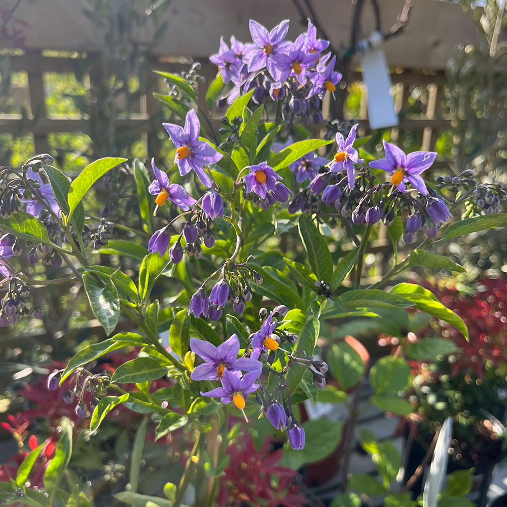 In milder areas or sheltered spots, it will remain evergreen, though it may lose its leaves in colder winters. It is ideal for covering large sunny walls, fences, or pergolas, where it can be tied into a support system. While it is a member of the nightshade family, it is far more ornamental than its vegetable relatives. It thrives in a hot, sunny position and is relatively drought-tolerant once established. To ensure it climbs vigorously and develops a healthy root system, we recommend using Rootgrow when planting.